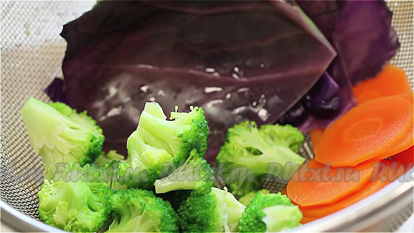 Отварить в течение 5 минут морковь, брокколи и фиолетовую капусту. А затем сразу опустить овощи в ледяную воду, так они не потеряют цвет.
