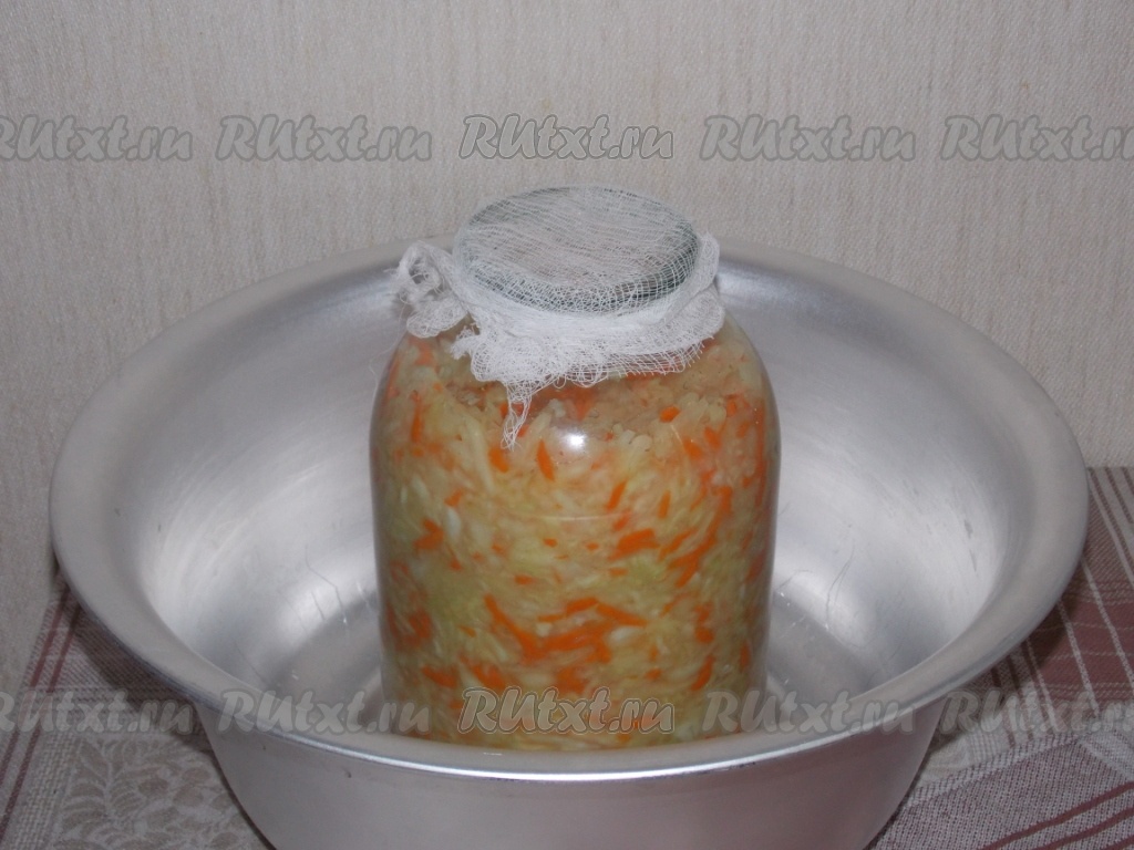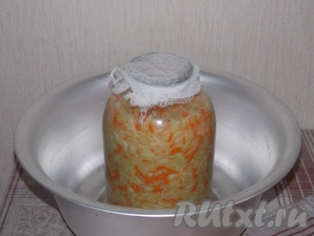 Капусту переложить в чистые и сухие банки. Укладывать надо достаточно плотно. Банки накрыть марлей и оставить при комнатной температуре. Наилучшая температура для брожения 20-22 °С.