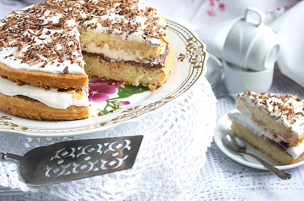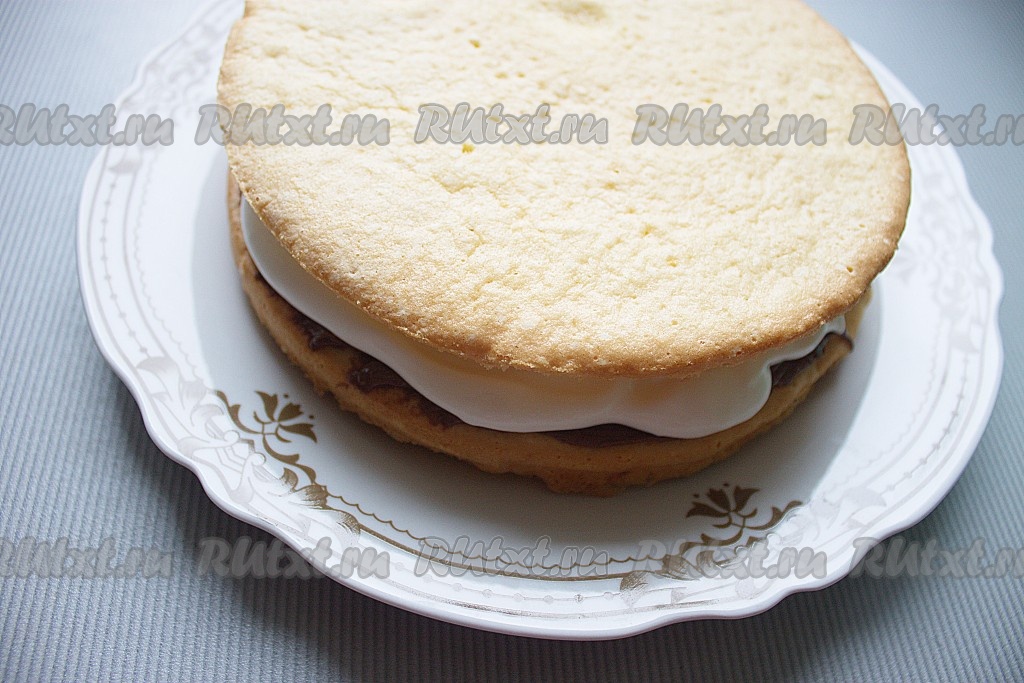 В кулинарной книге увидела очень интересный рецепт бисквита и торта, решила приготовить. Он меня заинтересовал тем, что этапы приготовления бисквита идут в обратном порядке - сначала взбиваются белки, а затем к ним добавляются остальные ингредиенты (в обычном рецепте взбитые белки - это завершающий этап!). И, конечно же, структура теста получается другой - более плотной, я бы сказала, немного влажной и чуть тягучей. Пропитывать я его не стала, но если кто любит очень "сочные" торты, то рекомендую коржи пропитать сиропом! Для начинки я взяла шоколадную пасту, типа "Нутелла", и крем-сливки - и вот такой у меня получился "Сэндвич".