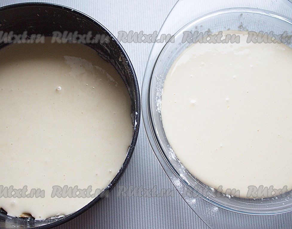 Две формы одинакового диаметра смазать сливочным маслом и посыпать мукой, поровну разлить тесто. Выпекать 30-35 минут до чуть золотистого цвета.