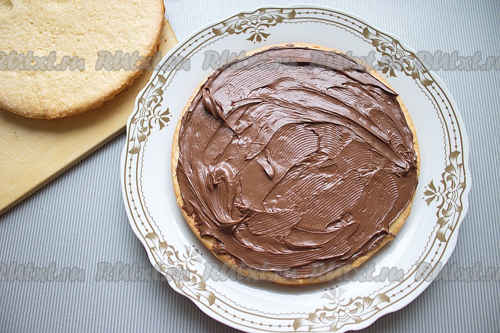 Собрать торт "Сэндвич": бисквит положить на блюдо, смазать равномерно шоколадной пастой.