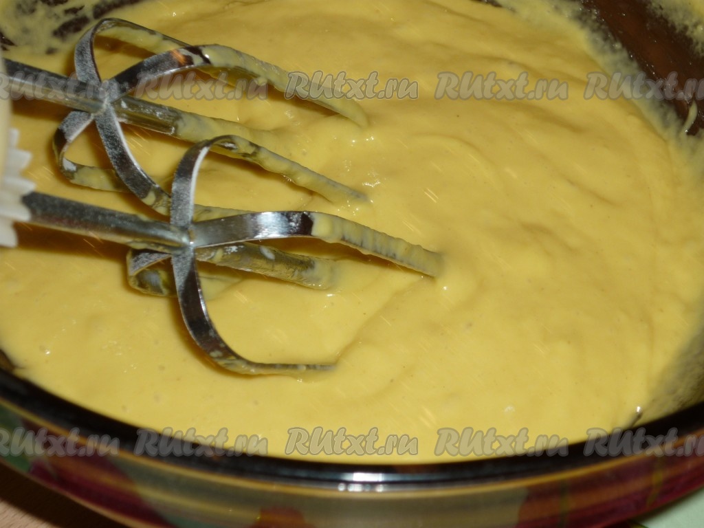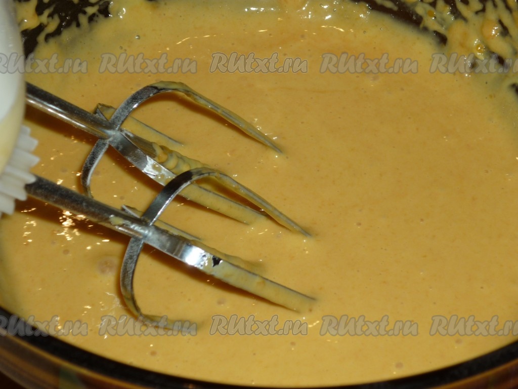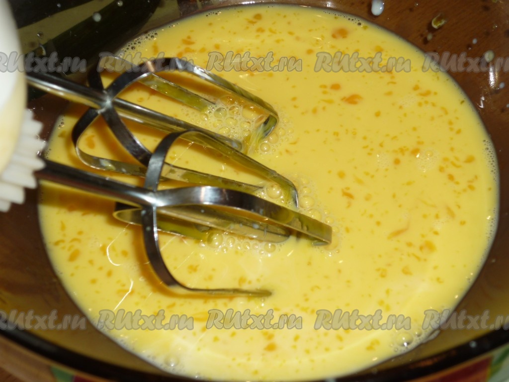 В смесь желтков и молока добавить муку, просеянную с разрыхлителем, щепотку соли и растительное масло. Влить оставшееся молоко, перемешать тесто миксером.