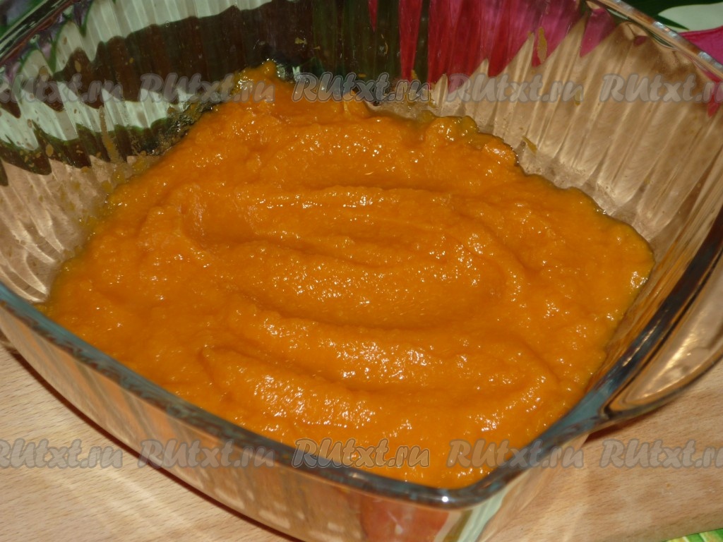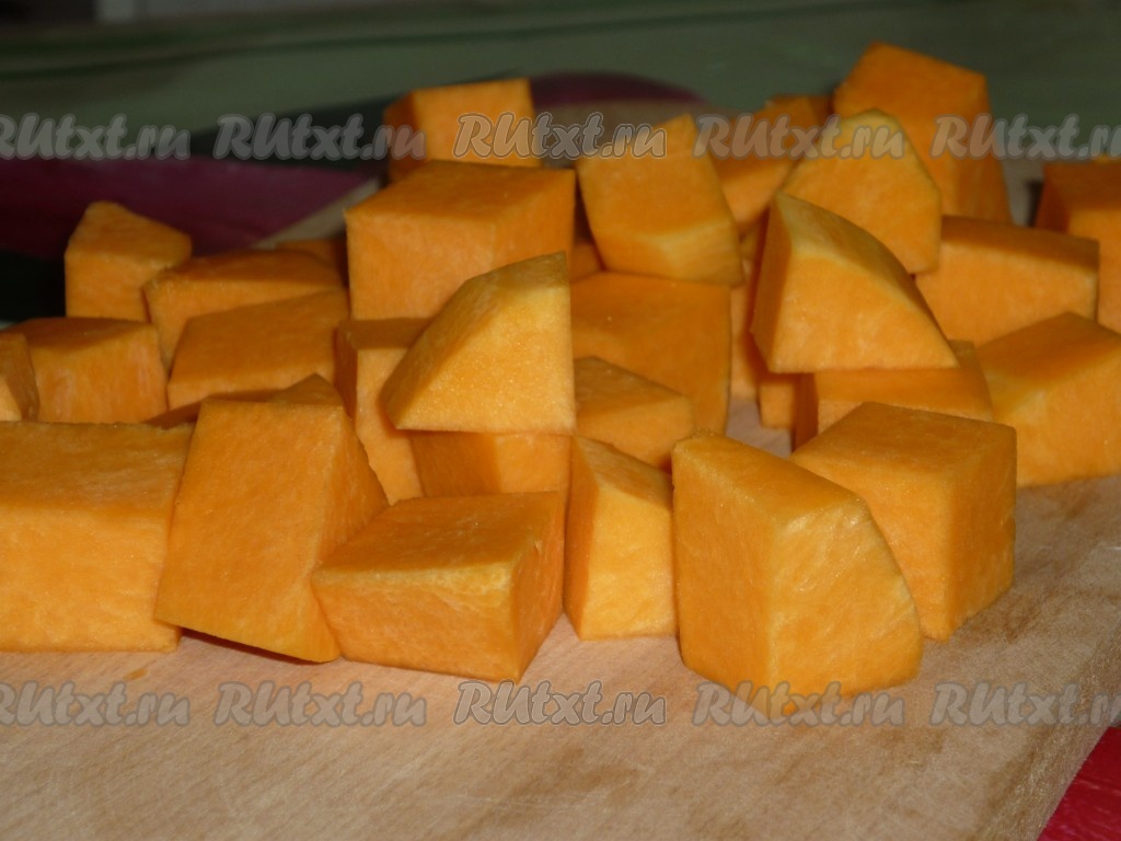 Для начала приготовим тыквенное пюре. Для этого грамм 300 тыквы, очищенной от кожуры и семечек, нужно нарезать на небольшие кубики, выложить на противень и запечь в разогретой духовке при температуре 180-200 градусов до мягкости (на это потребуется минут 35, готовая тыква должна легко прокалываться ножом). Продолжительность запекания зависит от сорта тыквы и толщины нарезки.