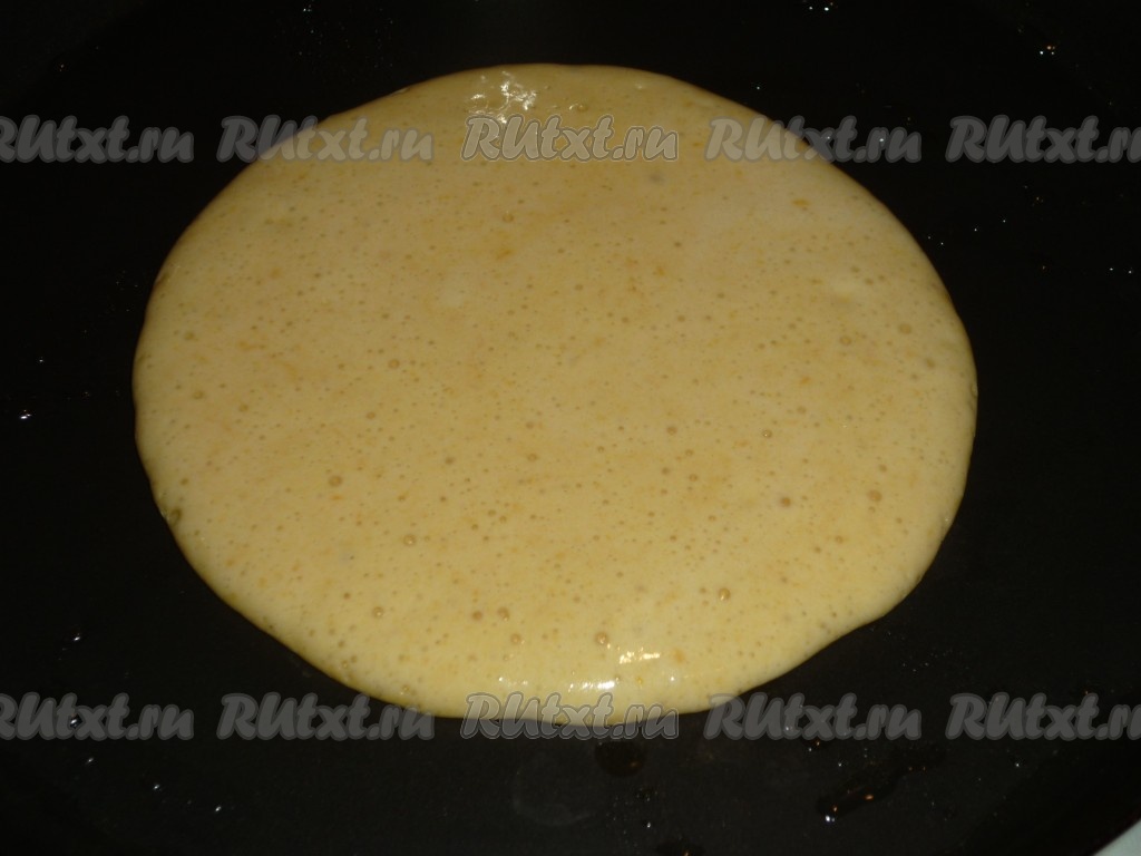Жарить панкейк на среднем огне. Панкейк покроется сверху пузырьками (это говорит о том, что пришло время переворачивать).