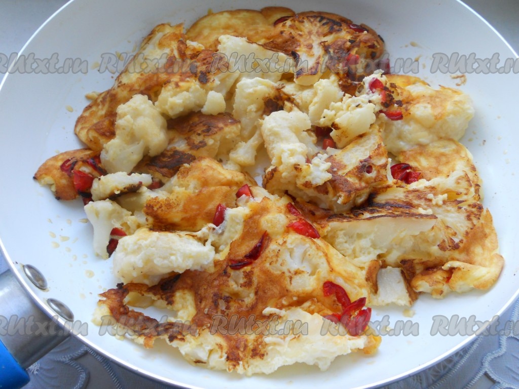 Накрыть сковороду крышкой, жарить цветную капусту с яйцом на самом минимальном огне до румяной корочки снизу. После этого капусту частями перевернуть на другую сторону и жарить еще минуты 2-3.