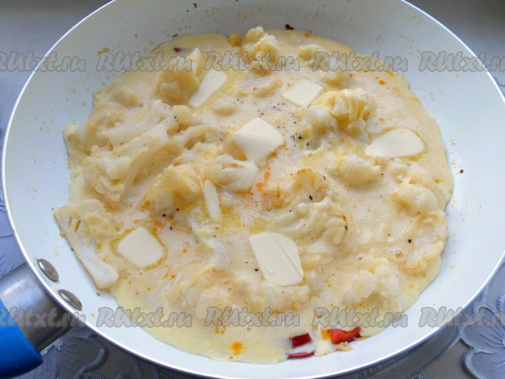 Залить капусту яично-сырной смесью, сверху поместить кусочки оставшегося сливочного масла (30 грамм), поперчить.