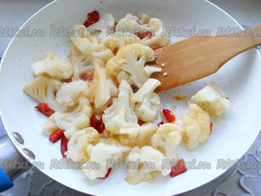 Затем в сковороду выложить цветную капусту. Перемешать с перцем и обжарить немного (минуты 4).