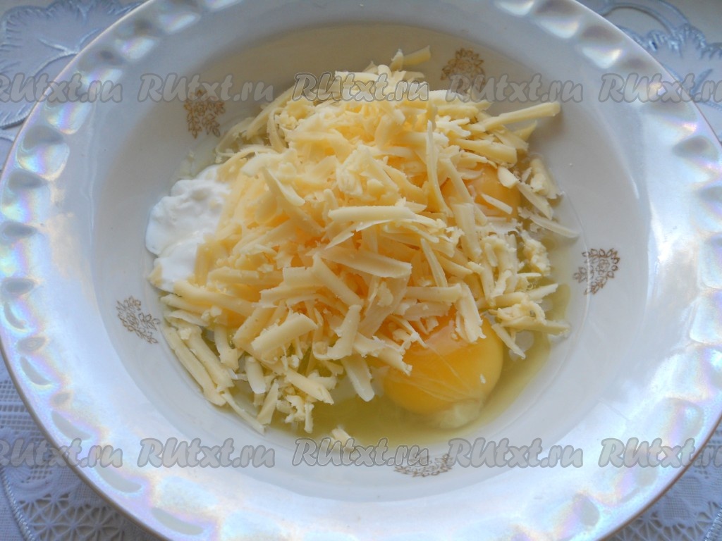 К яйцам добавить сметану и натертый на крупной терке твердый сыр. Хорошенько все перемешать венчиком. Посолить по вкусу.