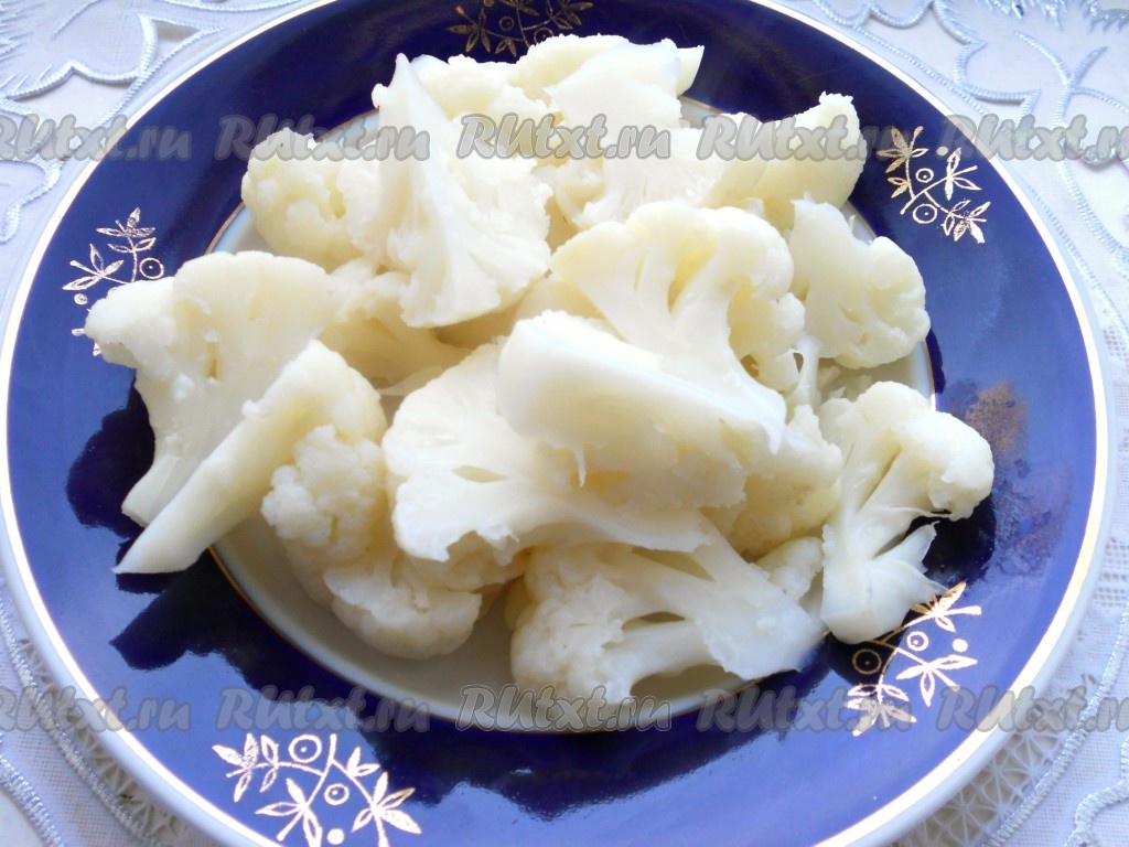Цветную капусту отварить в подсоленной воде 5-7 минут. Откинуть на дуршлаг, остудить, соцветия порезать пластинами.