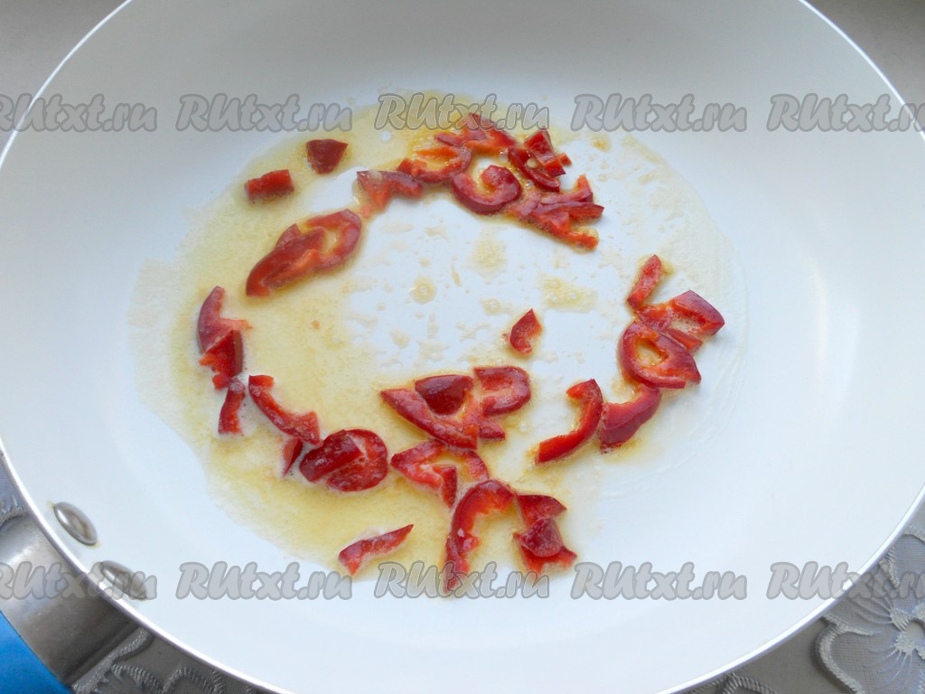 В сковороду поместить 30 грамм сливочного масла и порезанный мелкими кусочками сладкий болгарский перец. Обжарить на небольшом огне в течение 3-4 минут.