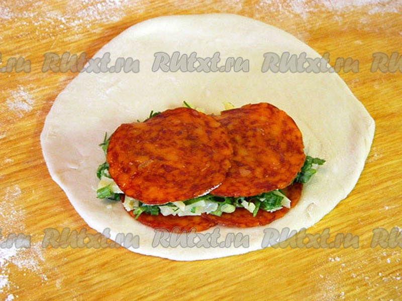 На раскатанные кусочки теста ближе к краю выложила по 2 тонких ломтика пепперони, приготовленную сырную массу, накрыла ещё двумя ломтиками колбасы.