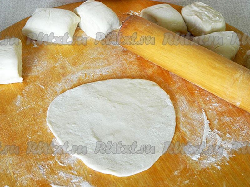 Разделила его на равные кусочки размером, как на пирожки. Раскатала каждый из них.