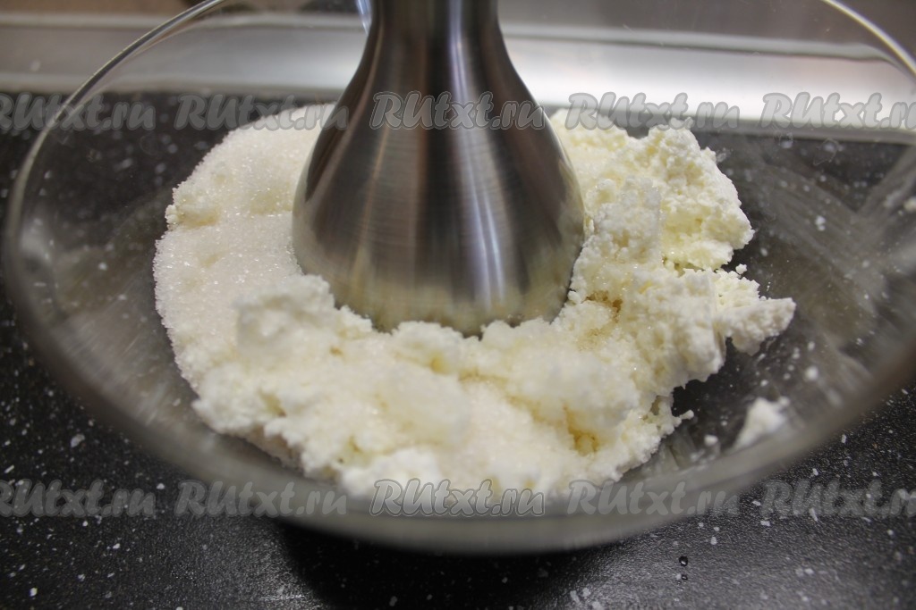 1. В миске взбиваем блендером творог с сахаром.