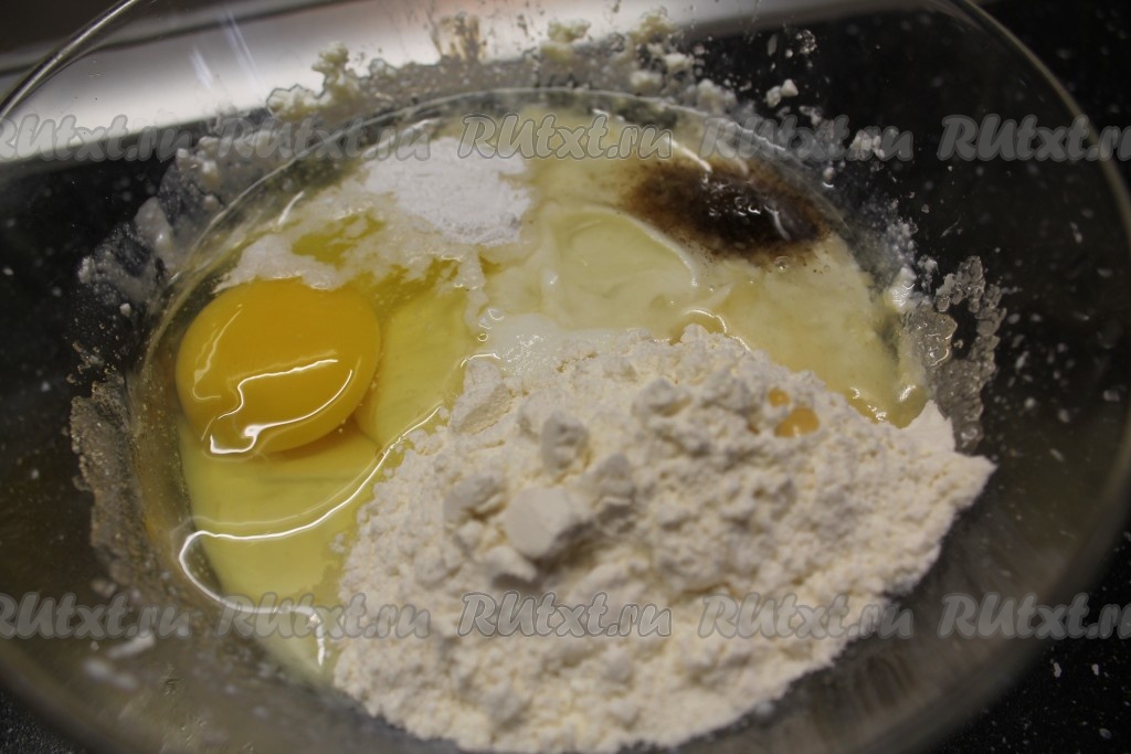 2. Добавляем 1 яйцо, муку, разрыхлитель и растительное масло. Хорошо перемешиваем.