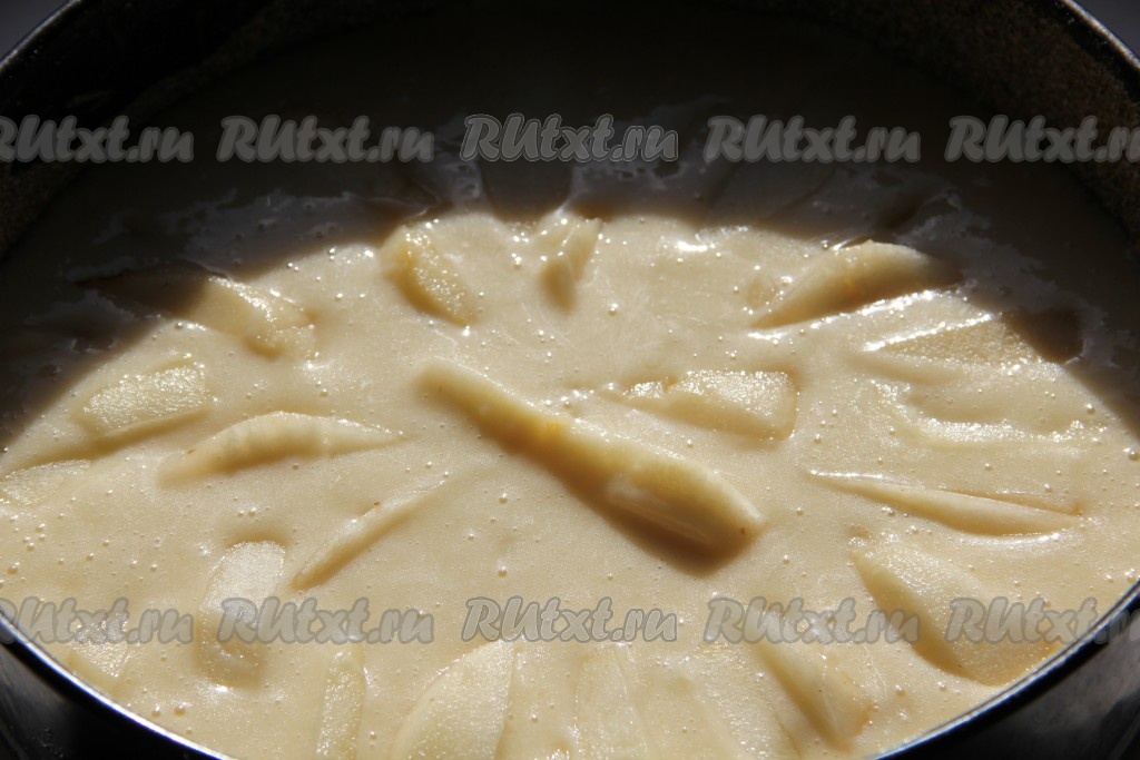 Форму для запекания смазать сливочным маслом и вылить в него тесто. Груши очистить от кожуры и семечек, нарезать дольками и выложить сверху на тесто, плотно друг к другу.