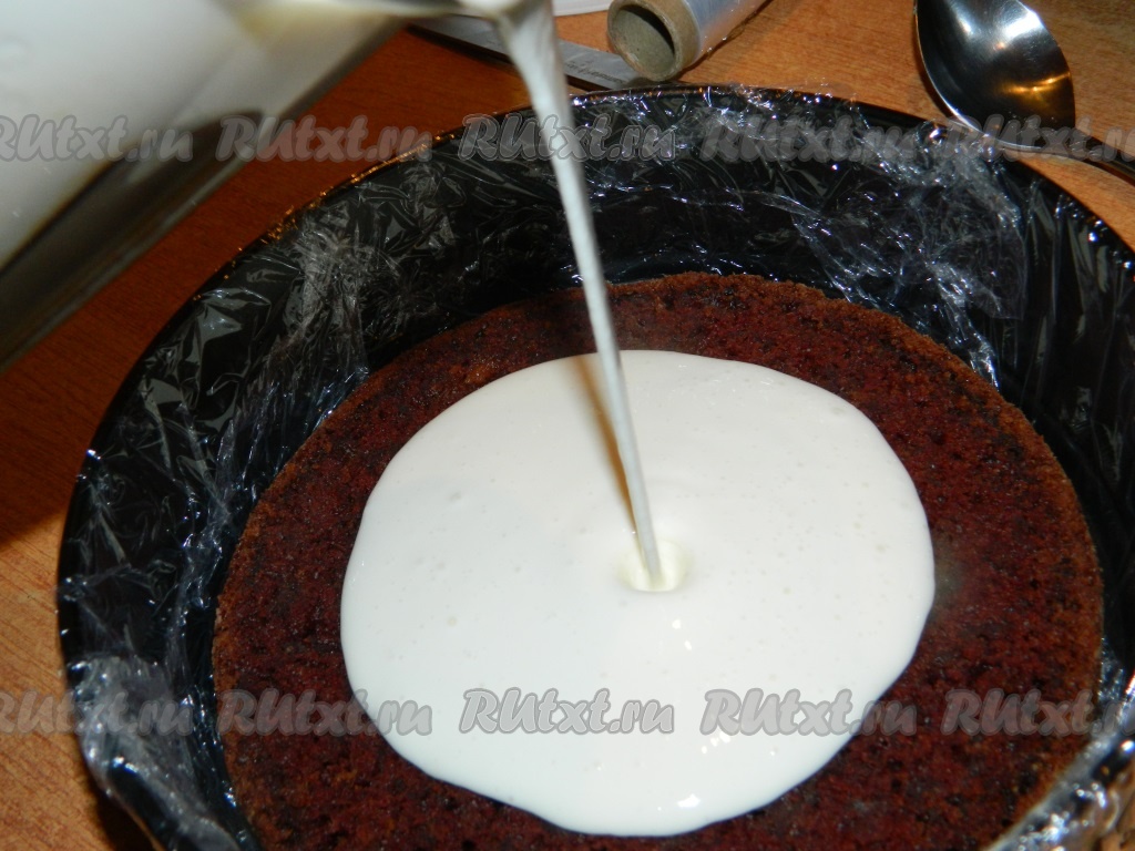 Затем на застывший крем выложить второй корж (если второй корж положить на не застывший крем, то корж начнёт тонуть). Если оставшийся крем начал густеть, его нужно слегка взбить блендером и сразу вылить на второй корж. Убрать торт в холодильник для полного застывания.