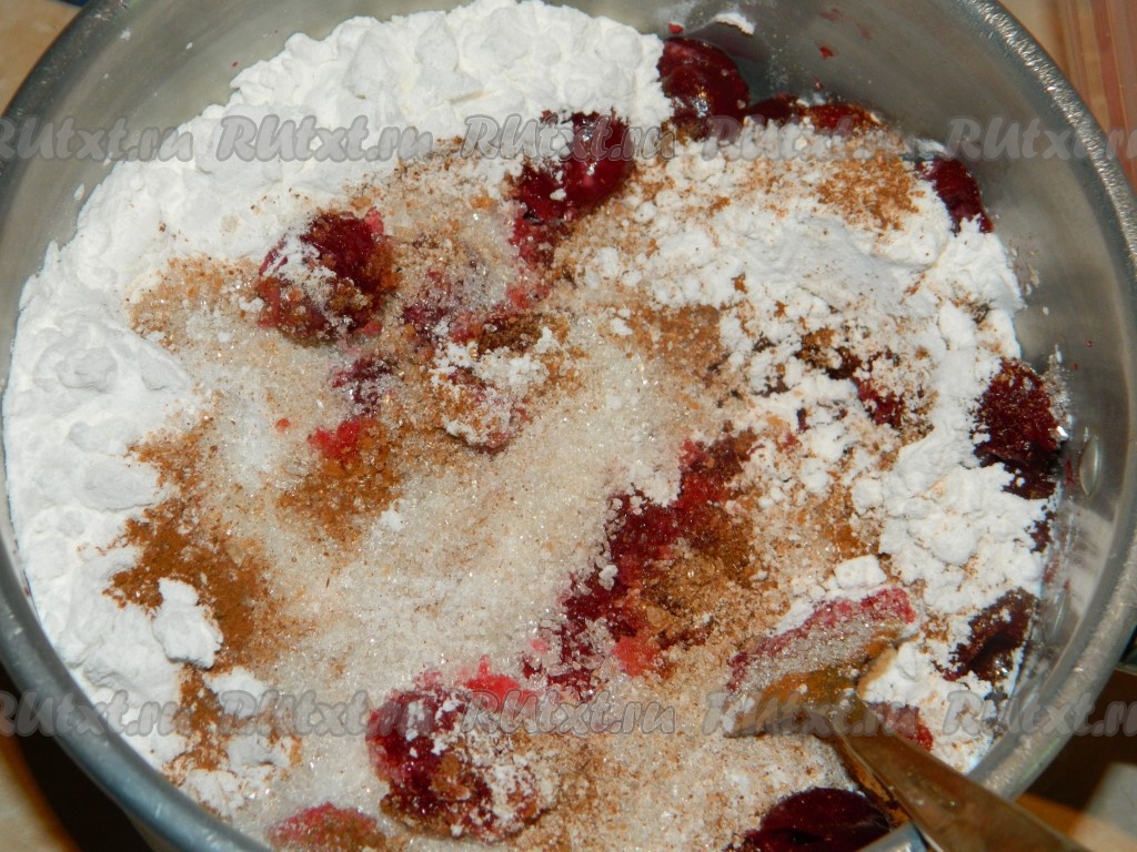 Если вишня замороженная, то разморозить. Для приготовления вишневого слоя смешать вишню, сахар, крахмал и корицу, поставить греться, постоянно помешивая. Нагревать до густоты.