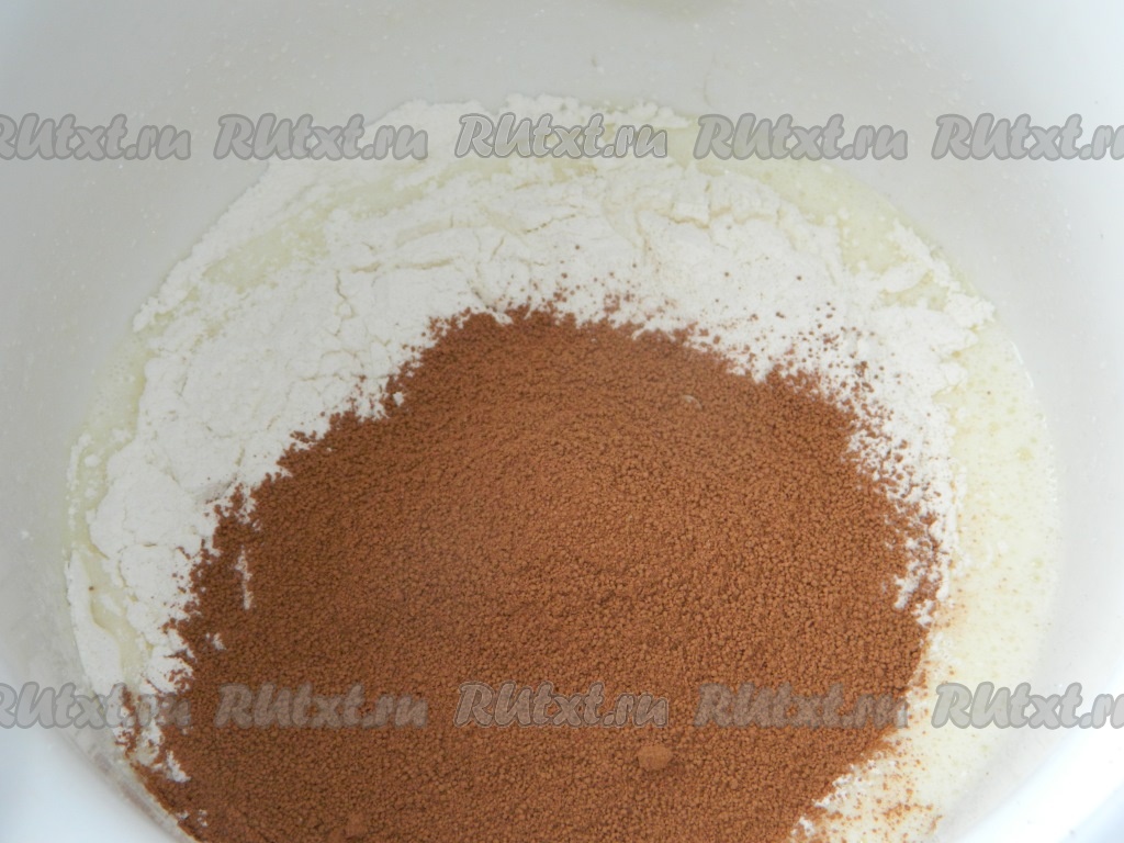 Во взбитую яичную массу добавить муку, ванилин, какао и соду.