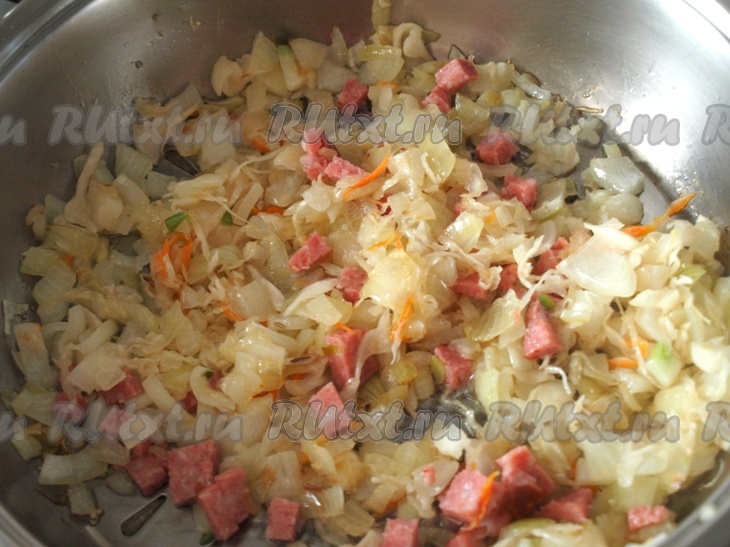 Пшено хорошо промываем несколько раз, заливаем кипятком и доводим до кипения. Воду сливаем и снова заливаем кипятком. Второй раз доводим до кипения и сливаем. Далее заливаем двумя стаканами кипятка, солим и варим на медленном огне около 20 минут. В пшенную кашу добавляем капусту с луком и колбасой, перемешиваем, накрываем крышкой, огонь выключаем. Укутываем кастрюлю полотенцем минут на 30.