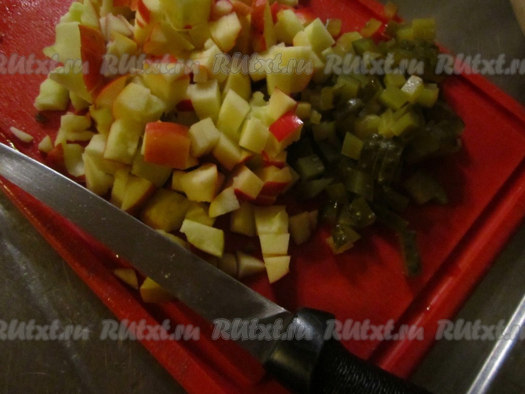 Яблоко очистите от сердцевины. Нарежьте яблоко и солёные огурчики мелкими кубиками.