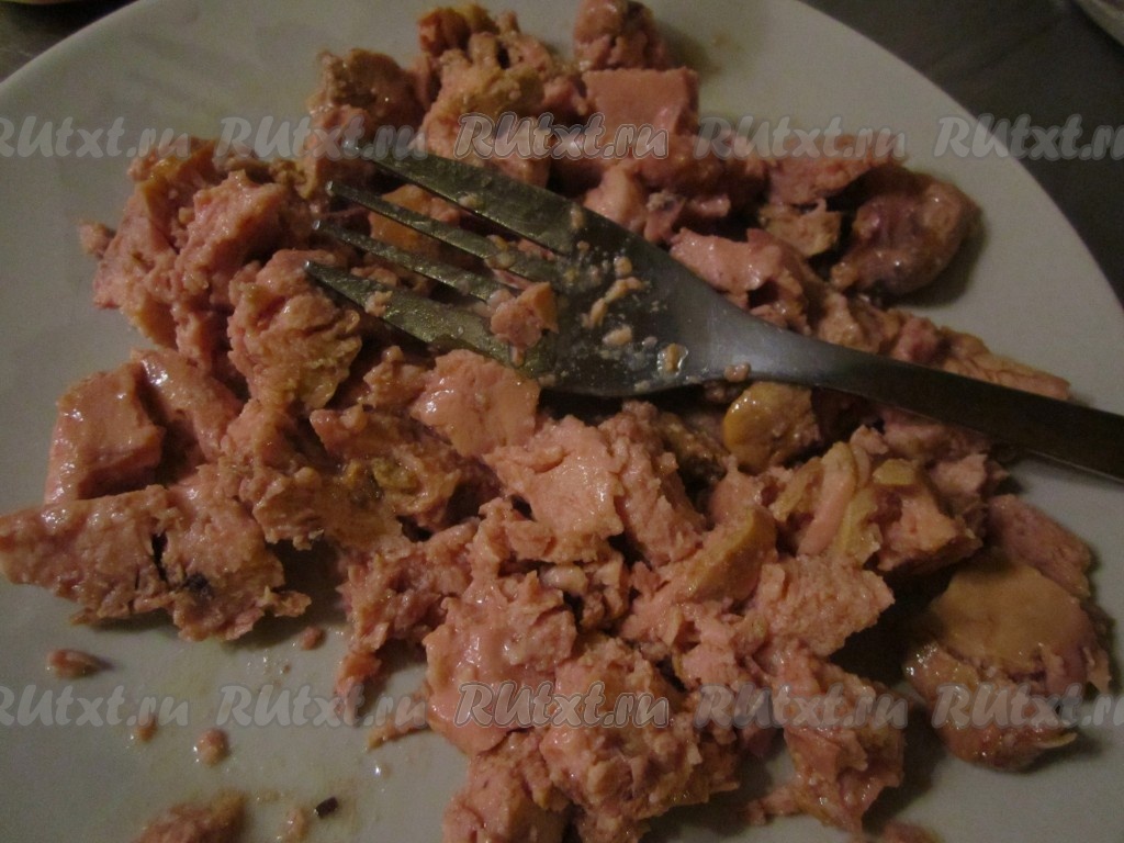 Печень трески выньте из банки и разделите вилкой на небольшие кусочки.