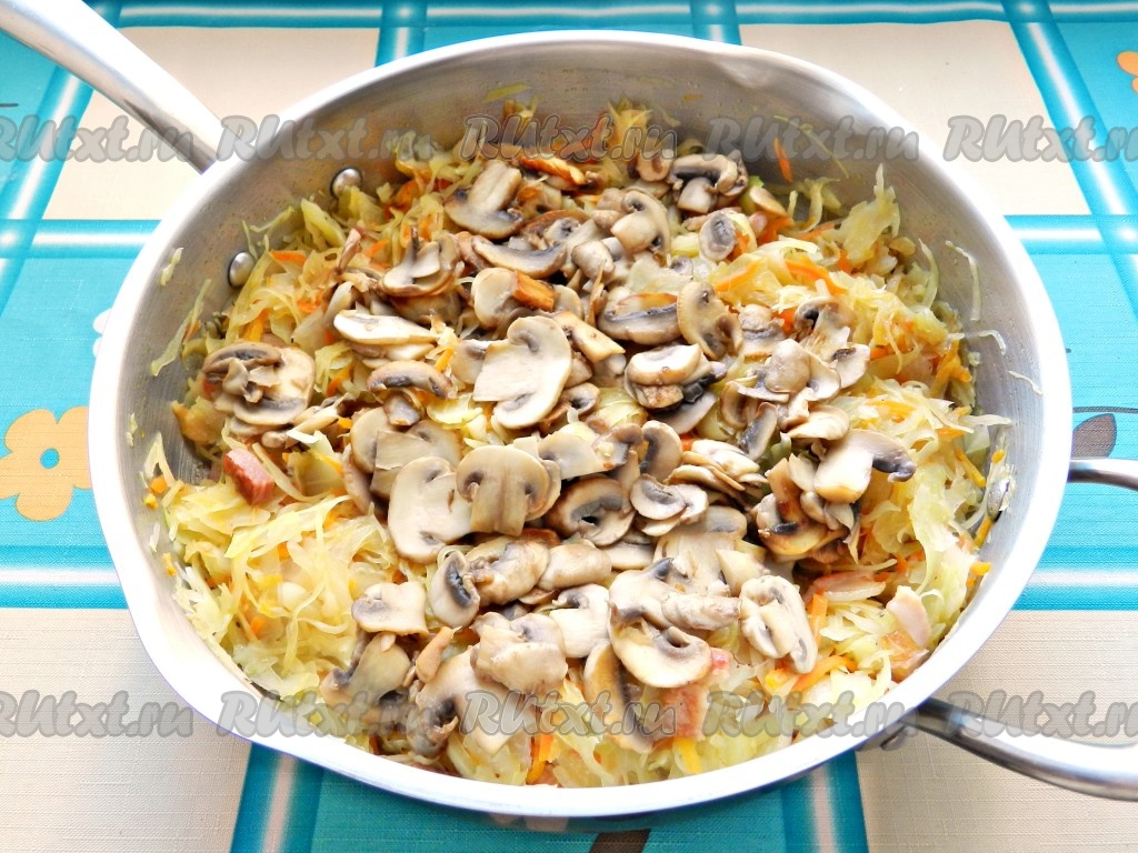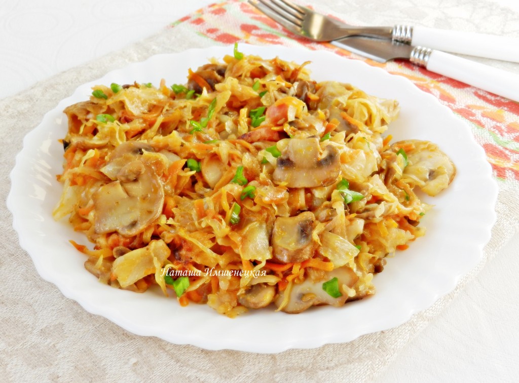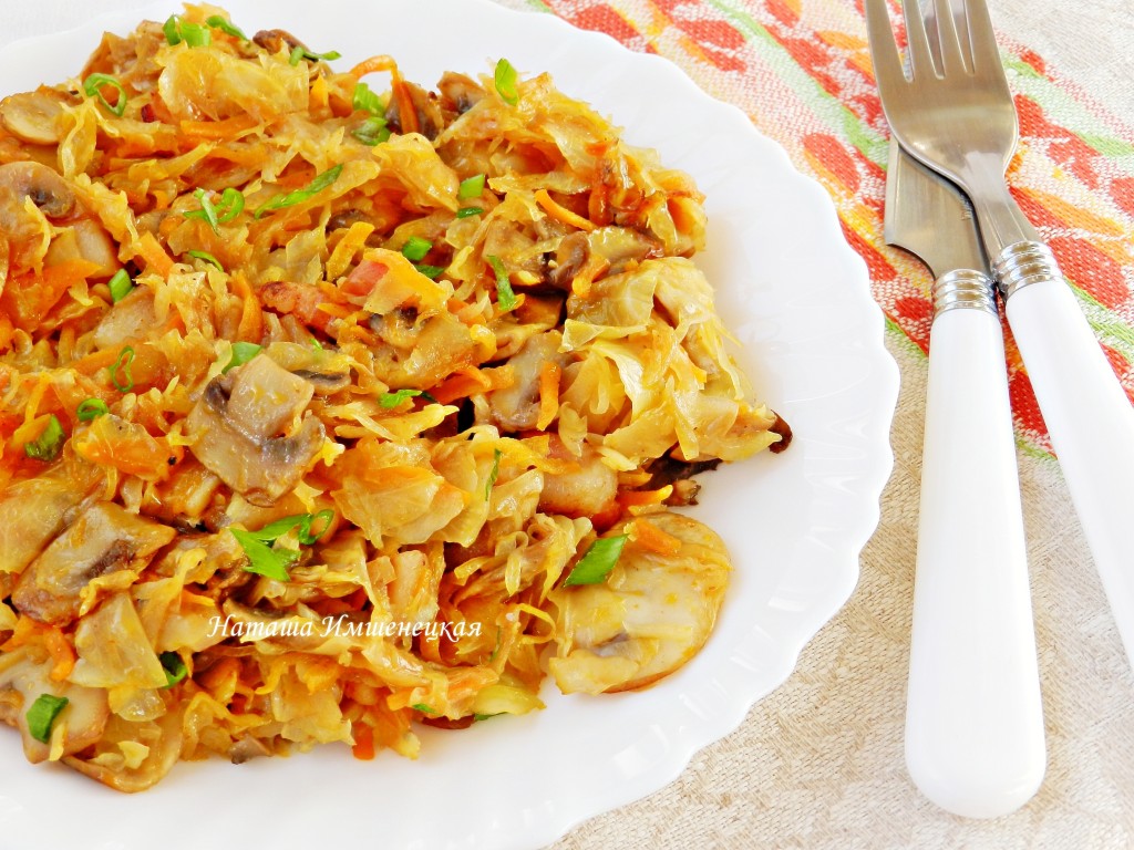 Вкусная и ароматная тушеная капуста с шампиньонами готова.