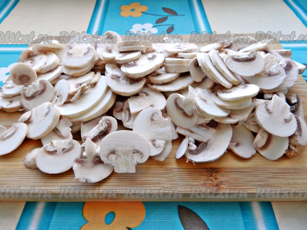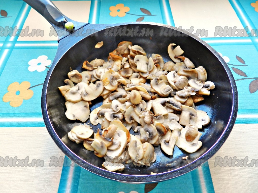 Выложить шампиньоны в сухую сковороду без масла, выпарить жидкость и обжарить в течение 3-4 минут.