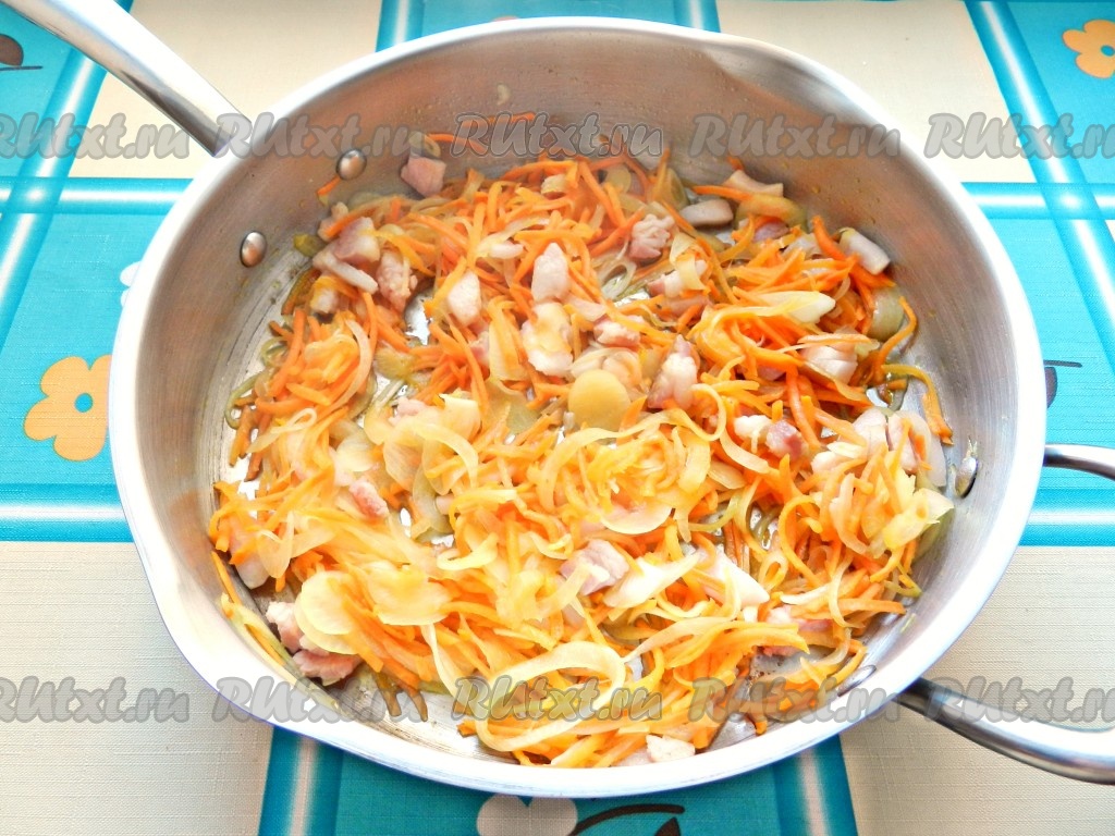 Лук нарезать полукольцами, морковь натереть на терке. Свиную грудинку нарезать небольшими кусочками, выложить на разогретую сковороду и прогреть. Добавить лук и морковь, обжарить все вместе до золотистого цвета.
