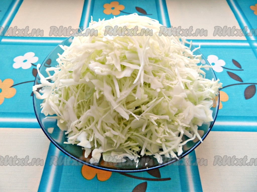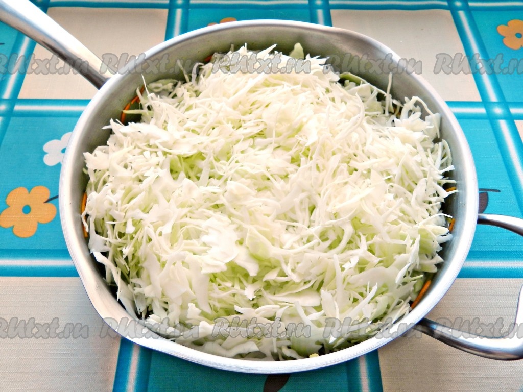 Выложить капусту в сковороду к луку и моркови, посолить, поперчить, перемешать. Готовить на среднем огне, пока капуста не уменьшится в объеме, затем накрыть крышкой и тушить на медленном огне около 30 минут.