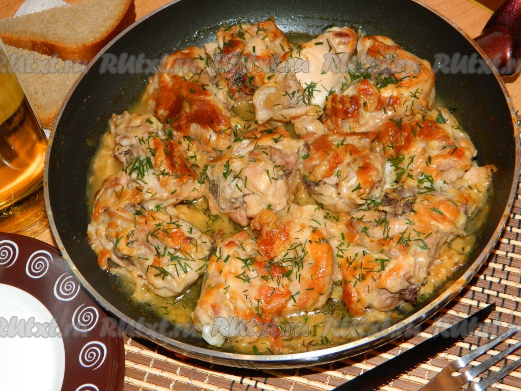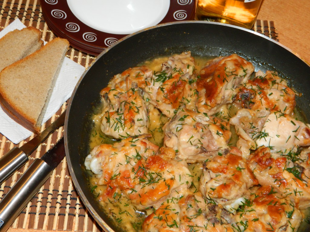А какой аппетитный запах стоит при приготовлении мяса... Курочку в горчичном соусе подаём на стол в сковороде, немного посыпав порезанным укропом.