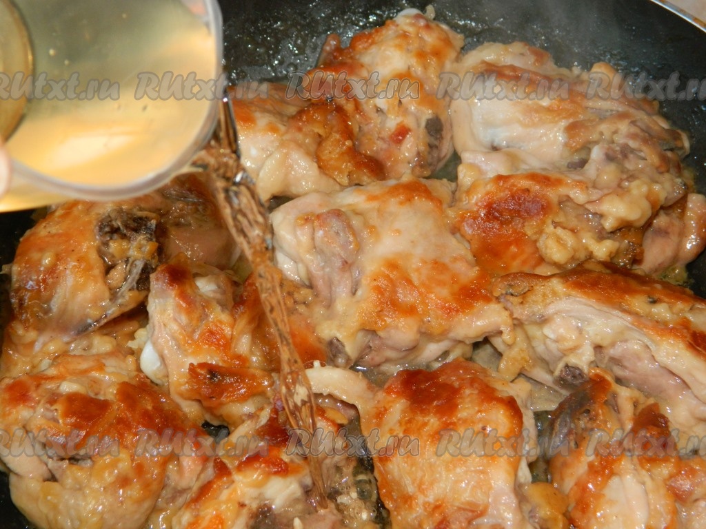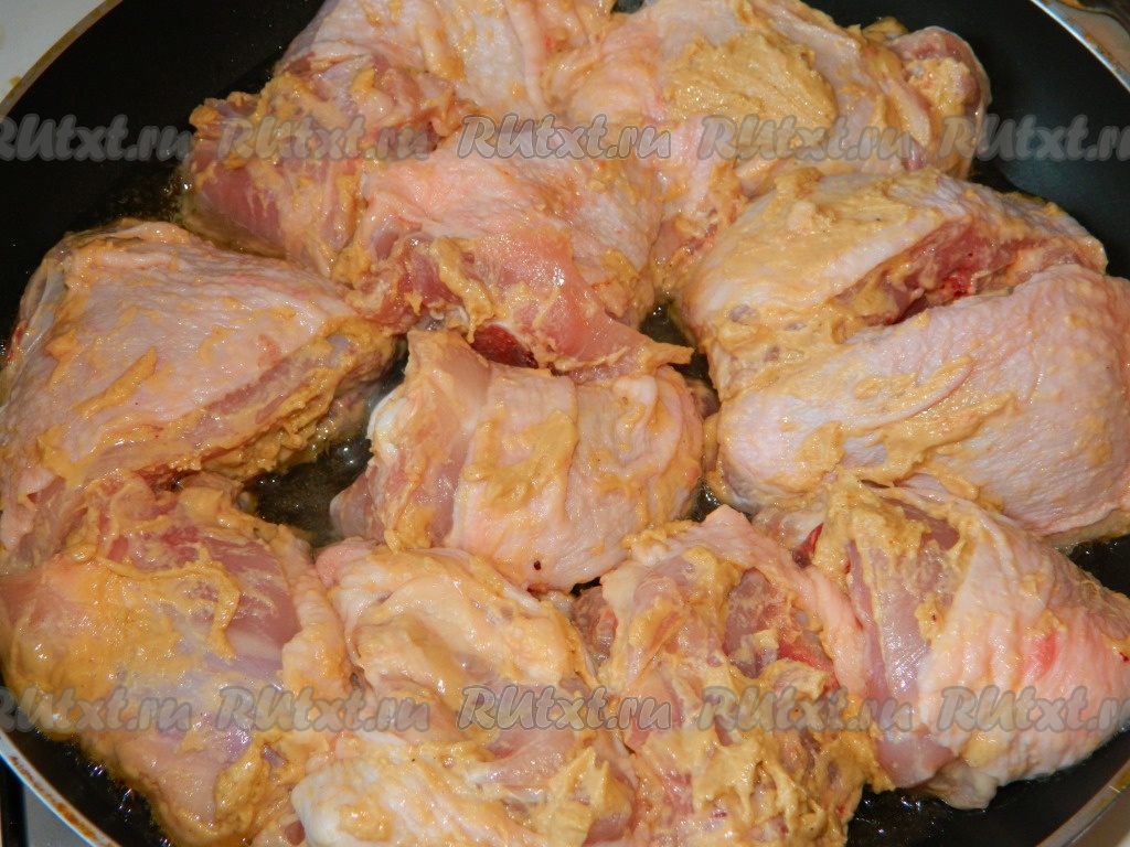 Курицу, порезанную на порционные кусочки, обмазываем горчичным соусом и выкладываем на сковороду. Жарим на небольшом огне, периодически переворачивая, минут 20.