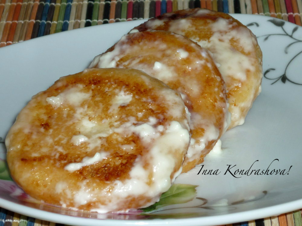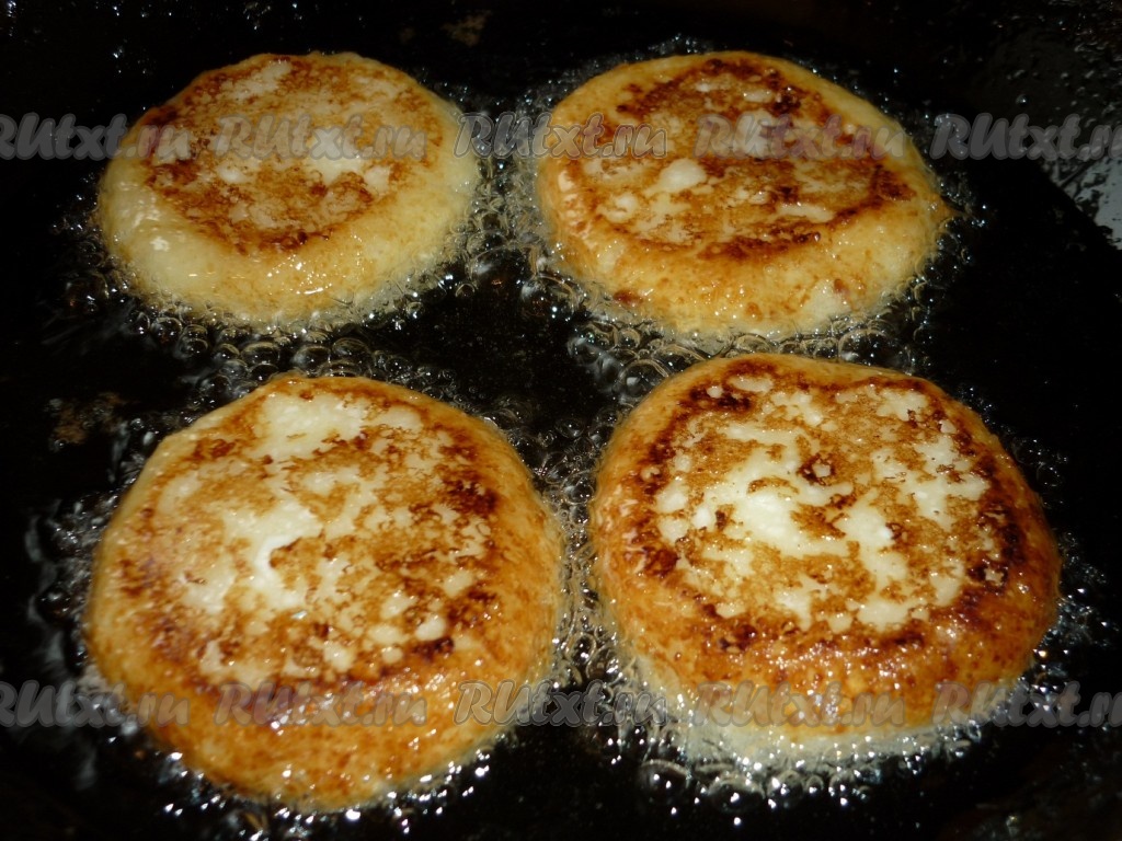 Из теста формируем сырники и обжариваем их на разогретом растительном масле до подрумянивания снизу.