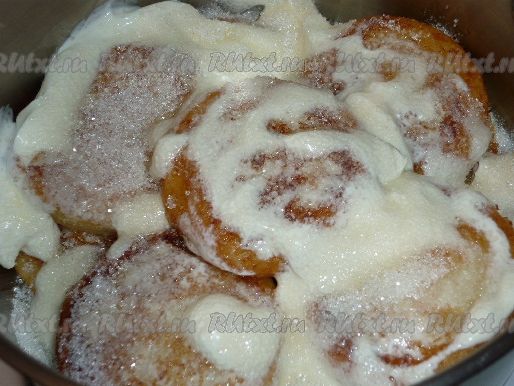 Поливаем сырнички сметаной, посыпаем сахаром, накрываем кастрюлю крышкой и тушим на маленьком огне минут 10.