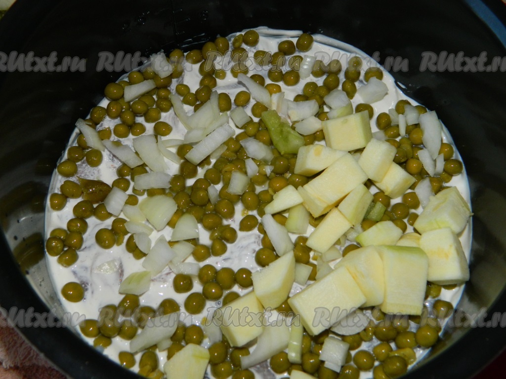 Поверх сметаны разложить кабачки, лук, горошек, немного посолить.