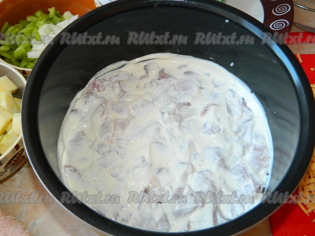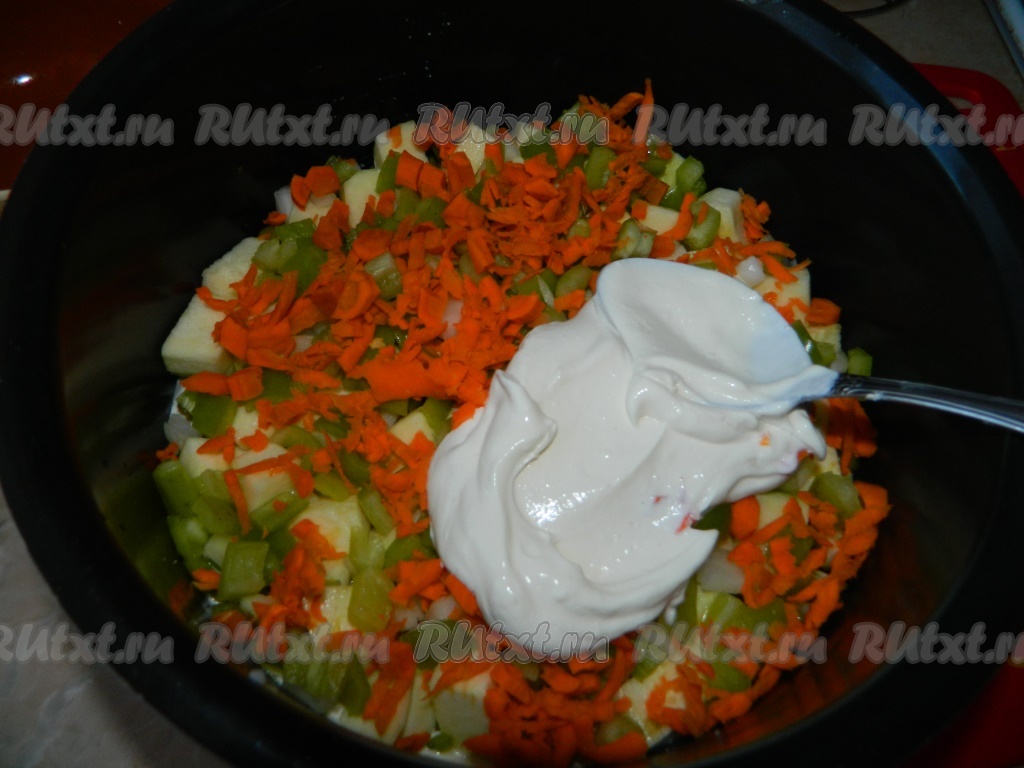 Затем разложить морковь, болгарский перец, смазать сметаной, посолить, поперчить.