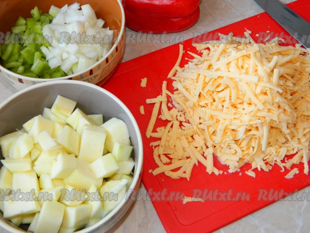 Пока варится рис, натереть морковь, порезать лук, кабачки, болгарский перец. Натереть на тёрке сыр.