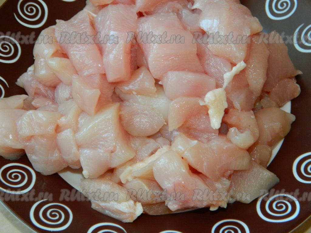 На дно мультиварки выложить рис, затем - куриное мясо.