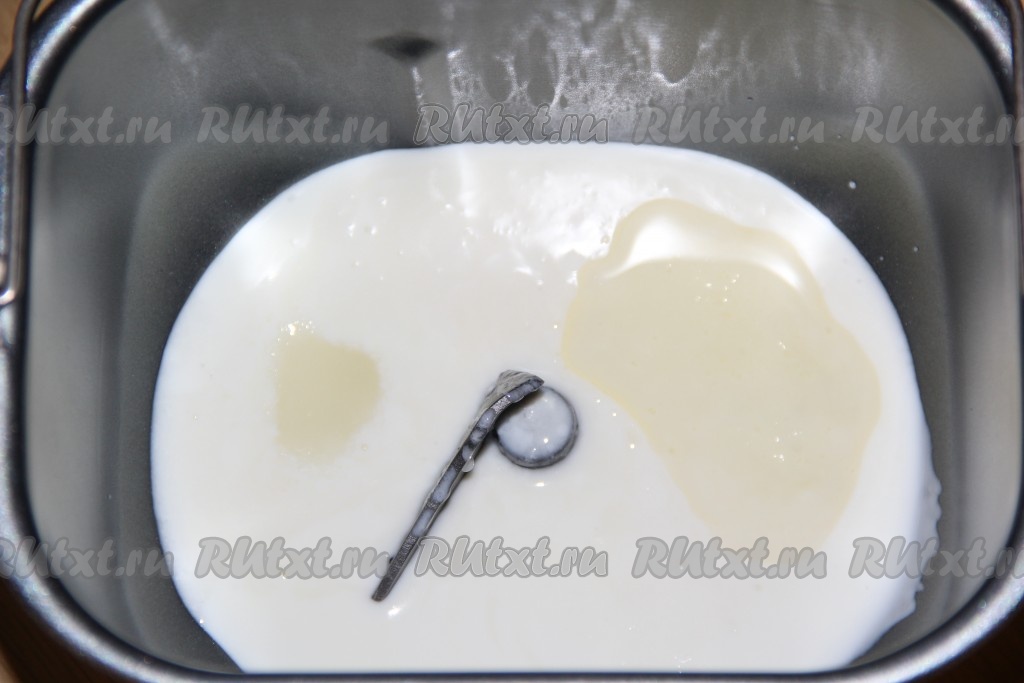В ведёрко хлебопечки влить кефир комнатной температуры и растительное масло.