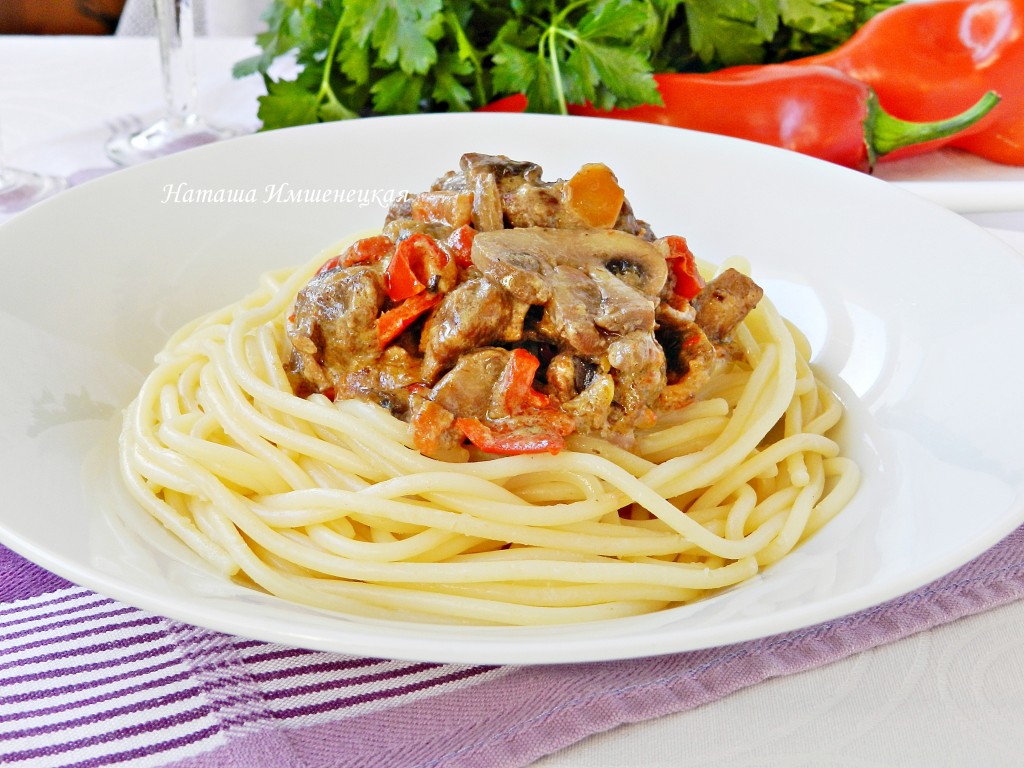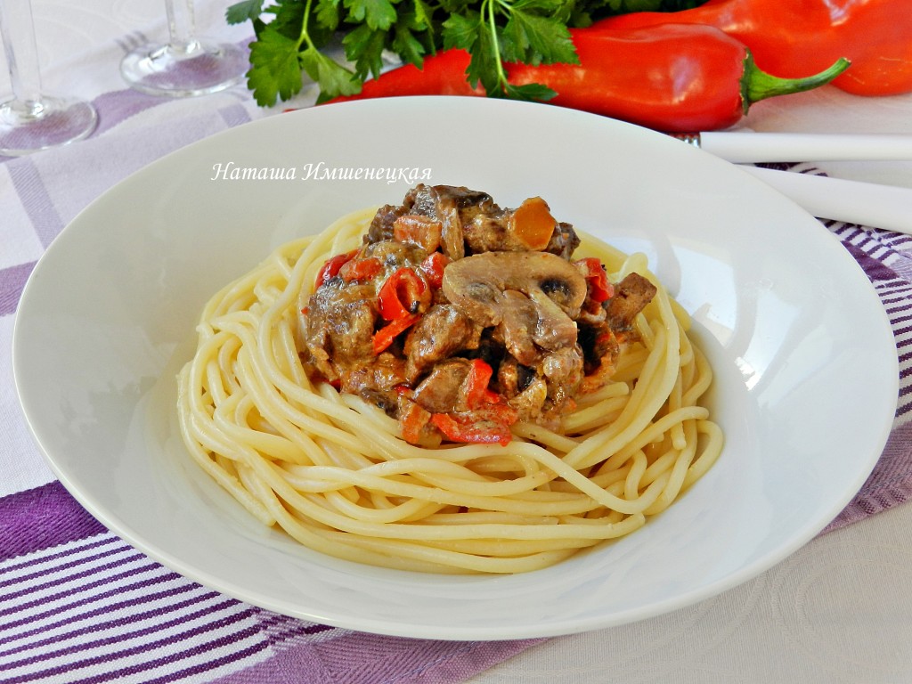 Горячие спагетти разложить по тарелкам, добавить мясо с грибами и подавать. Вкусные макароны с мясом и грибами готовы.