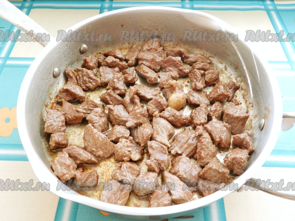 В сковороде разогреть масло и обжарить мясо на сильном огне до светлой корочки.