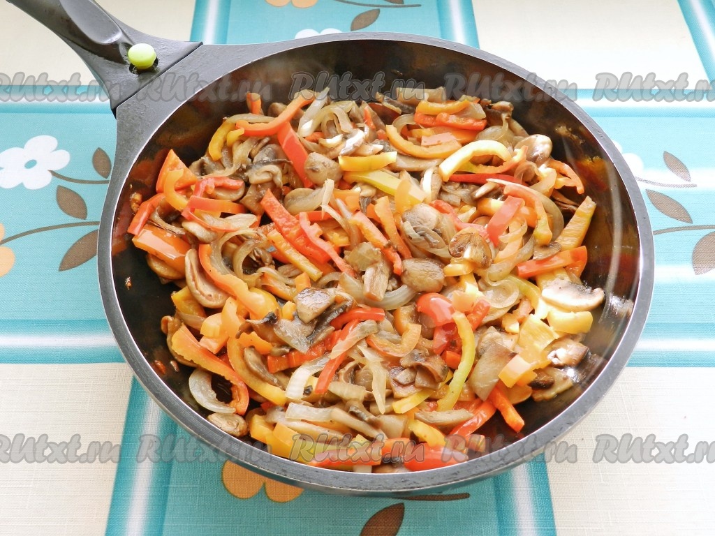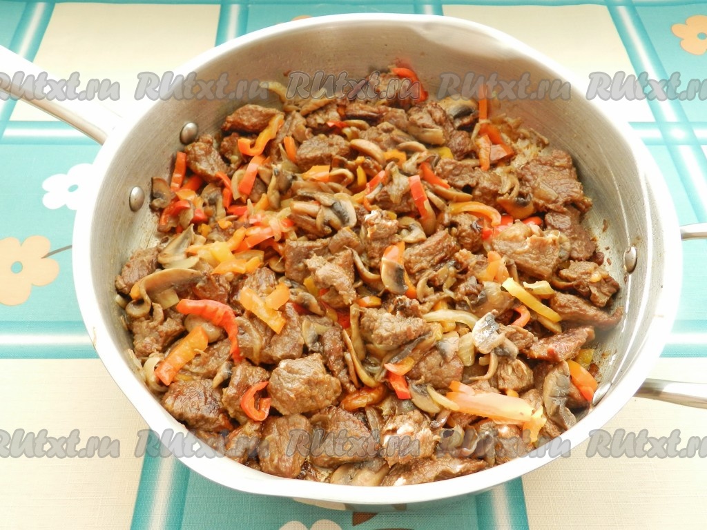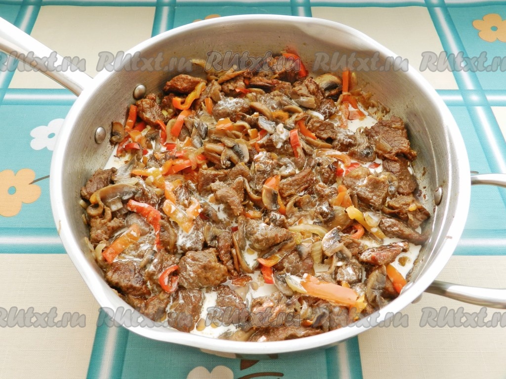 Когда мясо приготовится, соединить его с грибами и перцем.