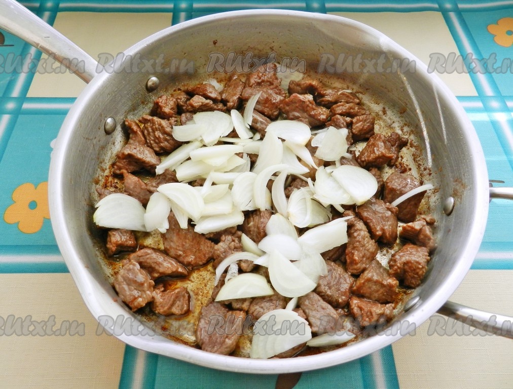Нарезать весь лук, половину выложить к мясу, перемешать. Обжарить все вместе, чтобы лук зарумянился. Влить немного горячей воды, чтобы покрыла мясо на половину, уменьшить огонь и готовить мясо под крышкой до готовности, в течение 1 часа.