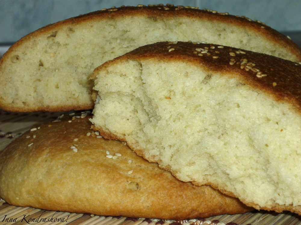 Слегка вымешиваем подошедшее тесто, делим его на 2 равные части и формируем лепешки. Выкладываем на противень, застеленный пекарской бумагой, даём тесту ещё раз подняться, затем посыпаем кунжутом и ставим в разогретую духовку на 30 минут при температуре 180 градусов.