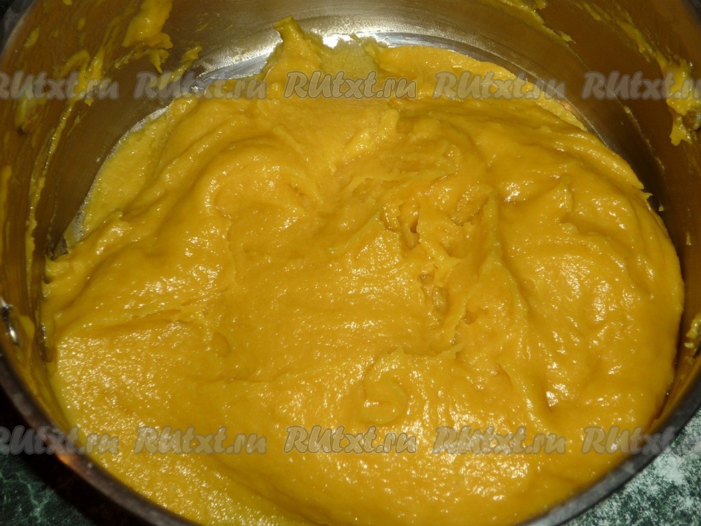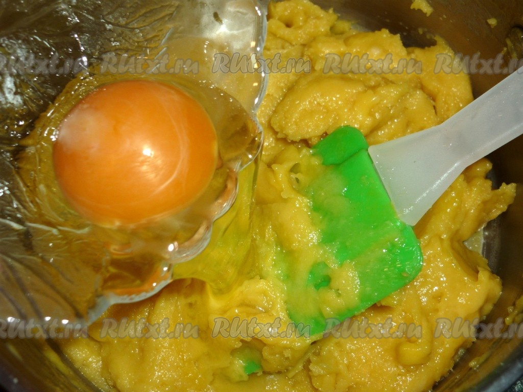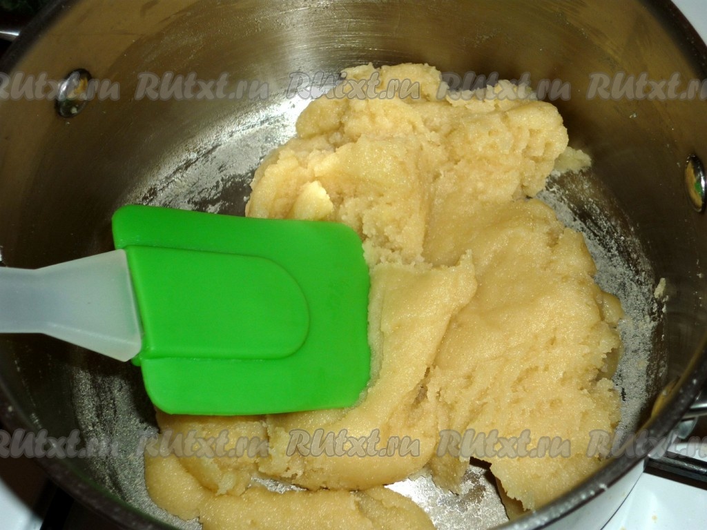 Снимаем тесто с огня, немного остужаем и вводим в него по одному яйца.