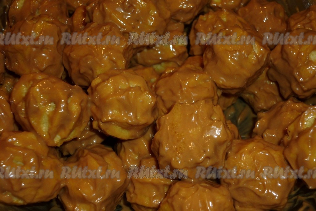 Наполняем полученным тестом кондитерский шприц и выдавливаем на противень, застеленный бумагой для выпечки, небольшие шарики.