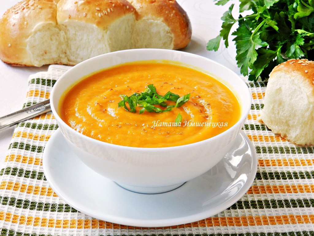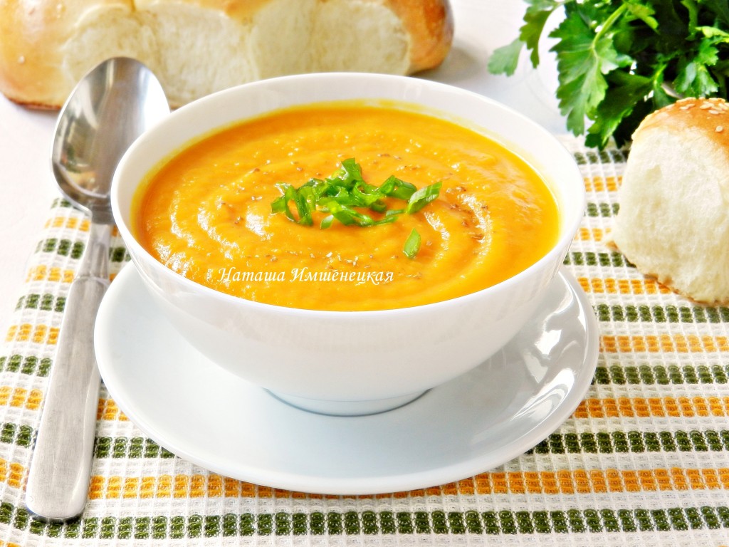 Вкусный, ароматный, яркий постный суп-пюре, приготовленный из тыквы и сельдерея, сразу подать к столу.