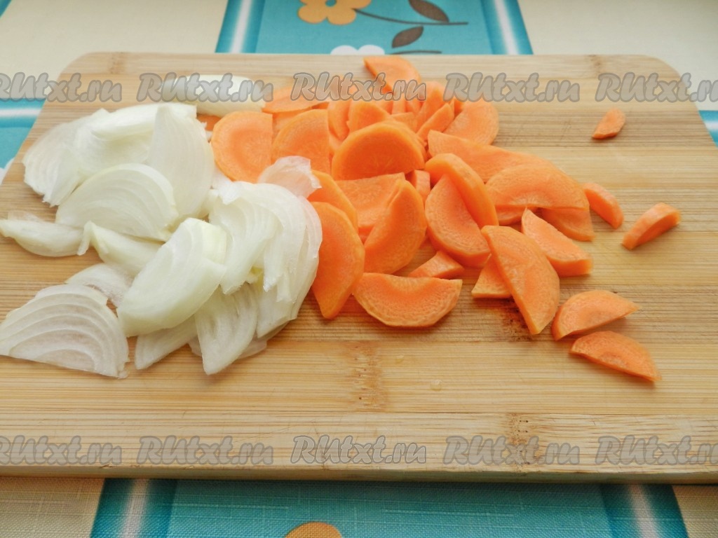 Очистить лук, морковь, корень имбиря. Лук нарезать на тонкие полукольца, морковь - на тонкие полукружочки.
