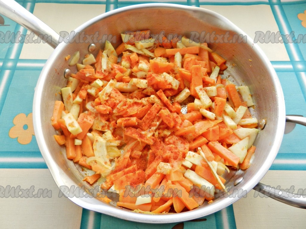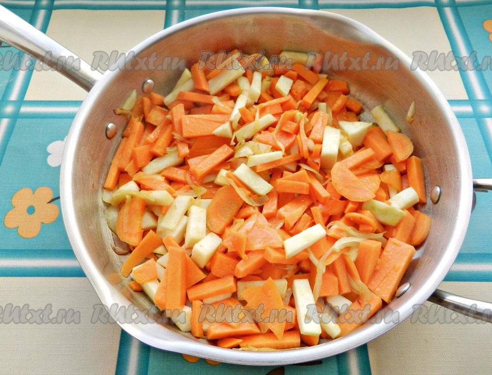 Добавить тыкву и сельдерей, обжарить овощи вместе около 5 минут, иногда перемешивая.
