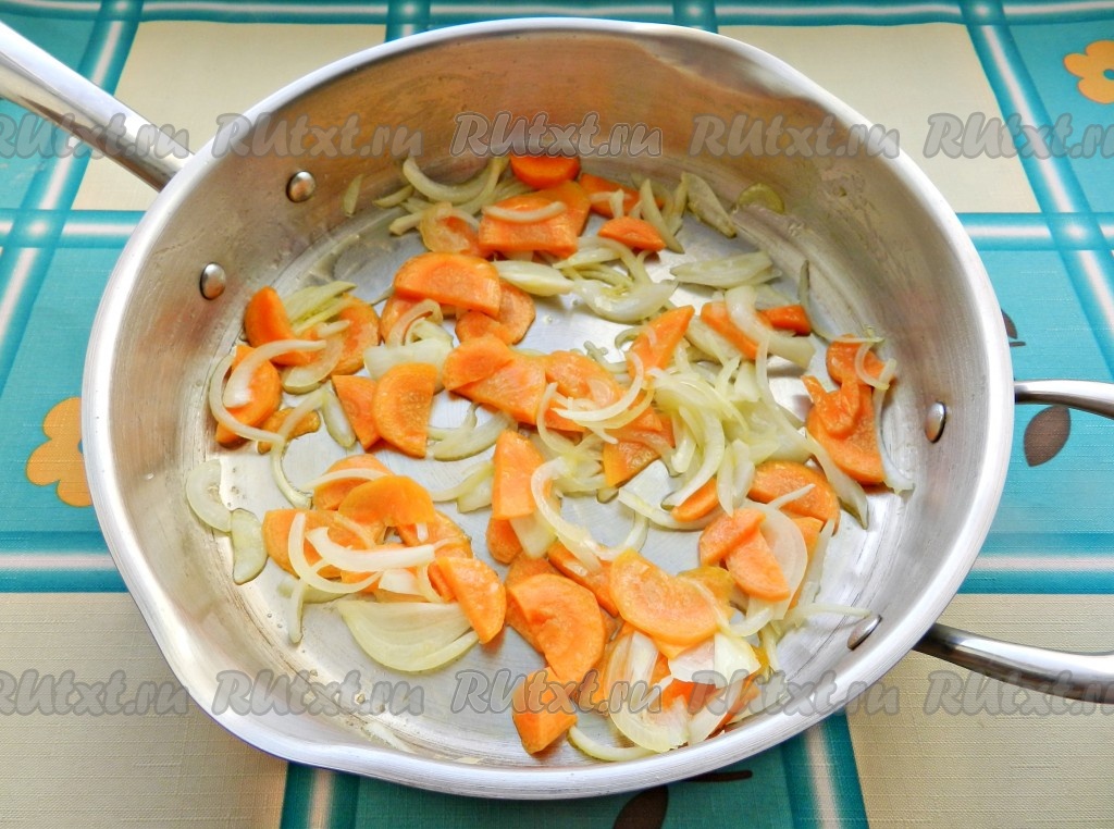 В сковороде разогреть растительное масло, выложить морковь с луком и обжарить их на среднем огне, периодически помешивая, до золотистого цвета со всех сторон, посолить и поперчить.