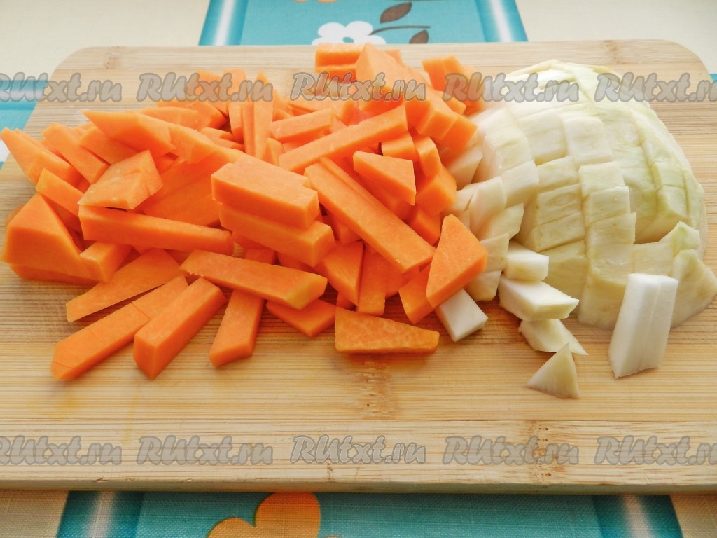 500 грамм тыквы, очищенной от кожуры, волокон и семян, а также 200 грамм очищенного корня сельдерея нарезать на брусочки.